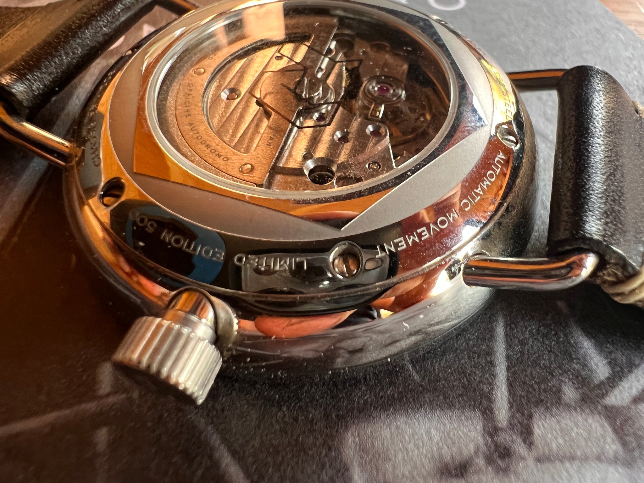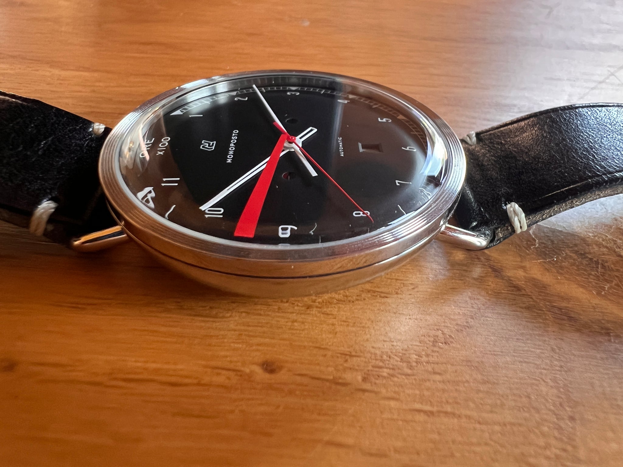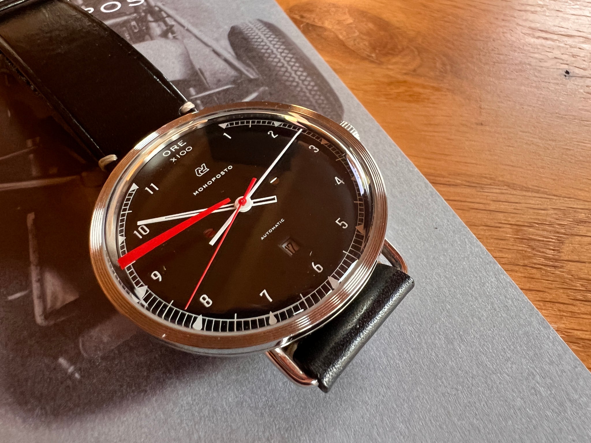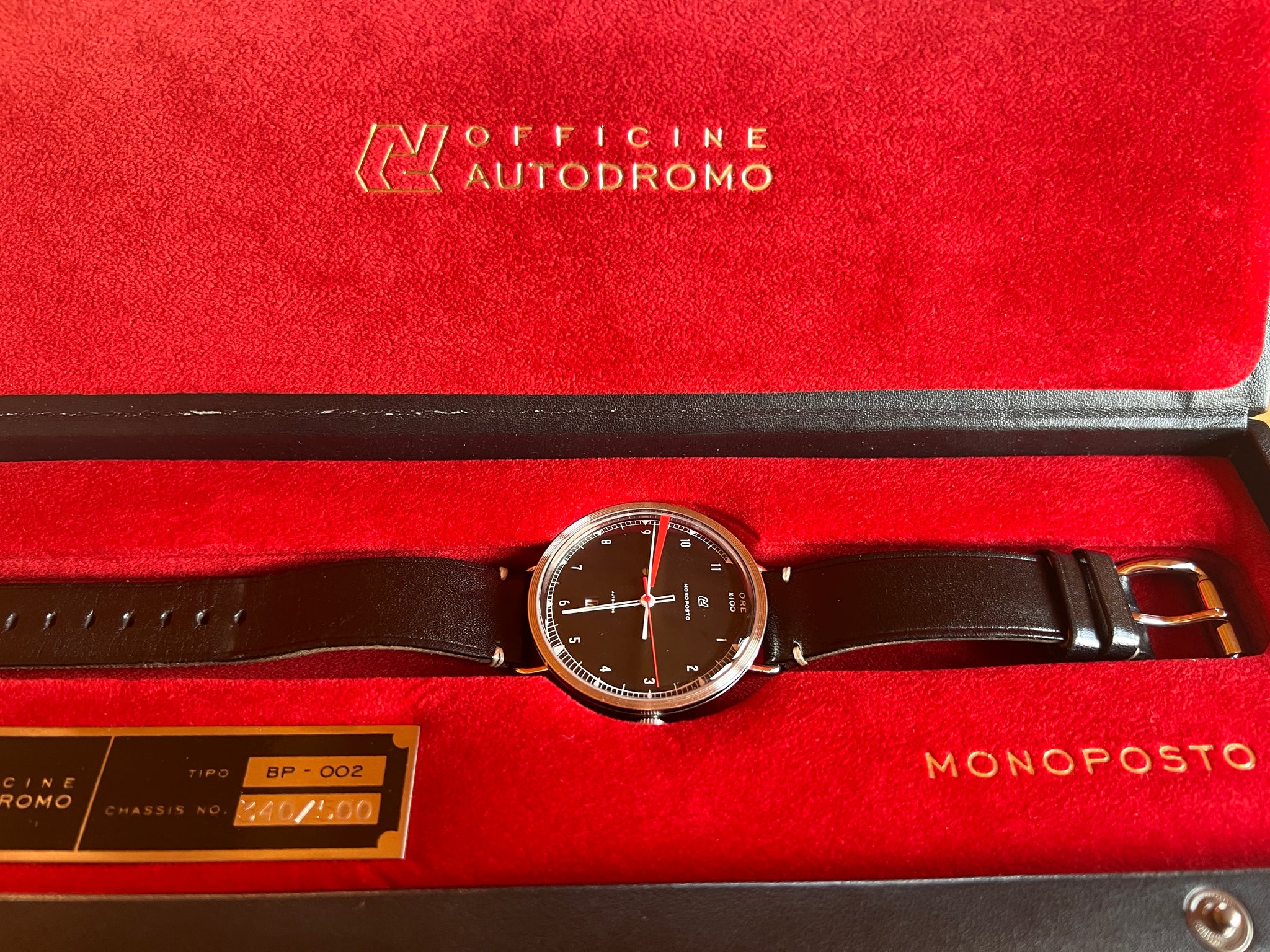 The Monoposto automatic iwas Autodromo's first ever mechanical watch, produced in a Limited Edition of 500 pieces, with 250 Black dials and 250 silver dials. It is powered by a Miyota 821A self-winding movement with calendar complication.