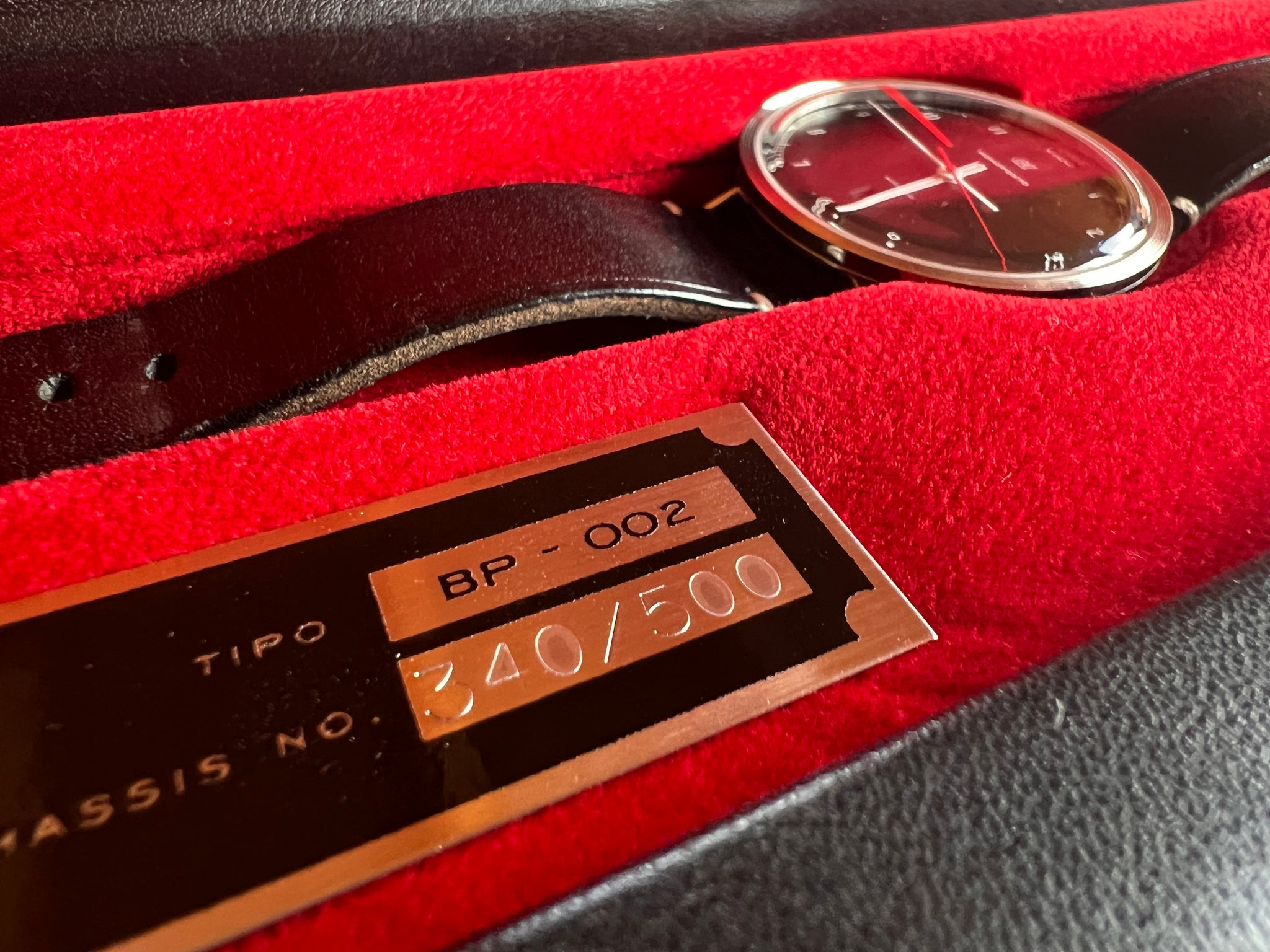 The rugged, bridle leather strap is equipped with a polished roller buckle just like the hood straps on a vintage grand prix car.