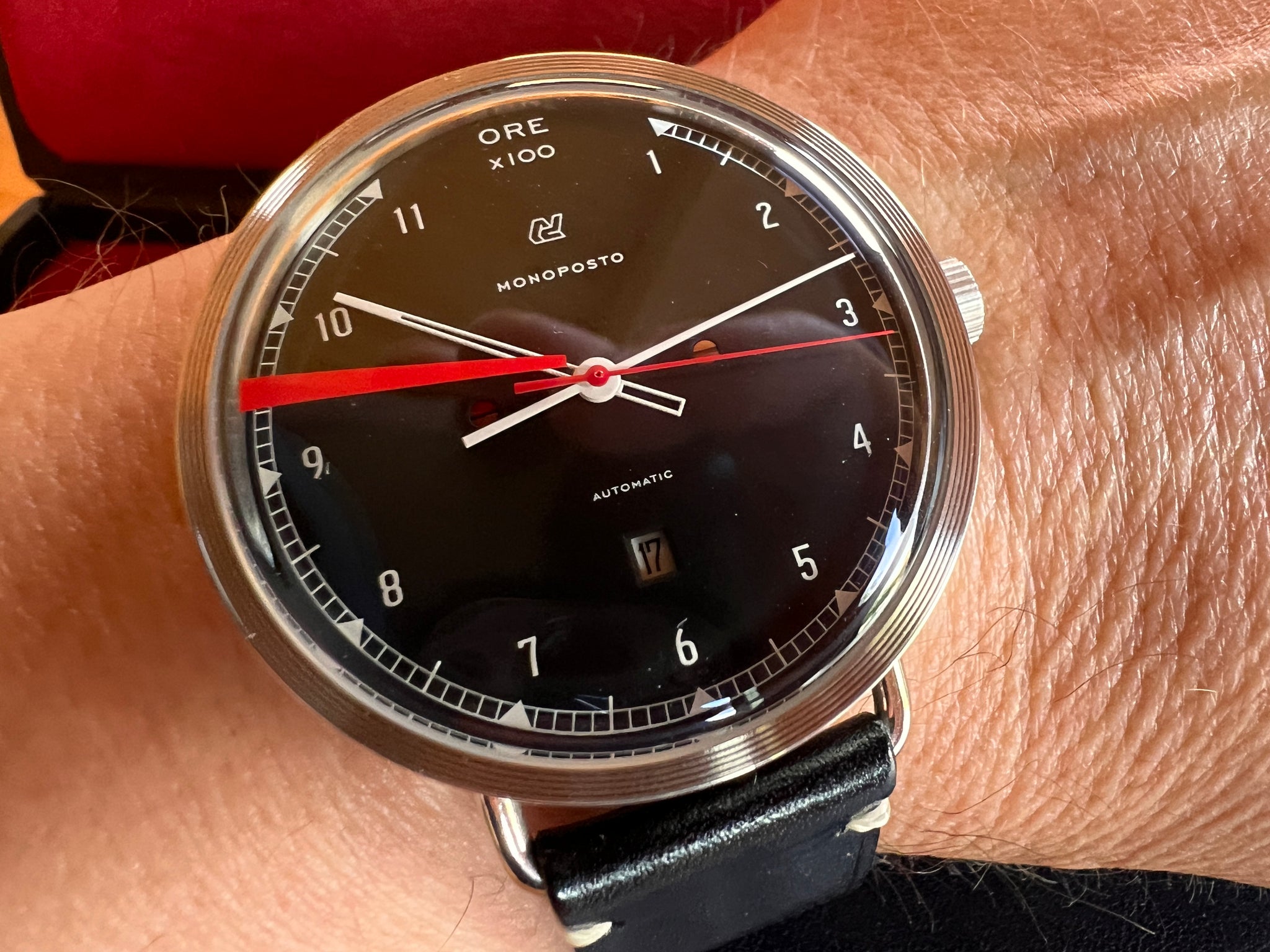 Monoposto is Italian for “single-seater,” and the watch is accordingly inspired by dashboard gauges from 1950s-era grand prix racing cars. It was common practice for racing mechanics in the 1950s to paint a red line onto the glass of the rev counter so the driver would know when to shift. T
