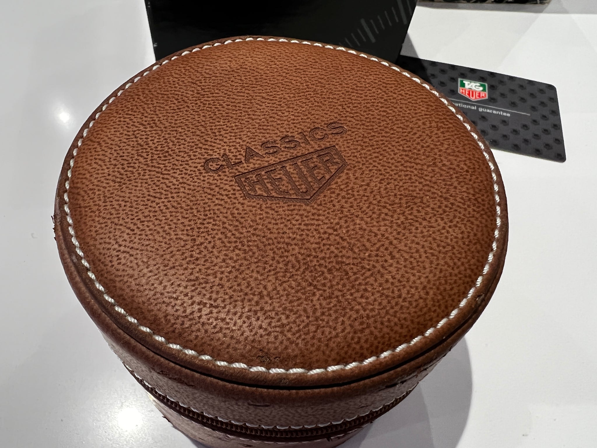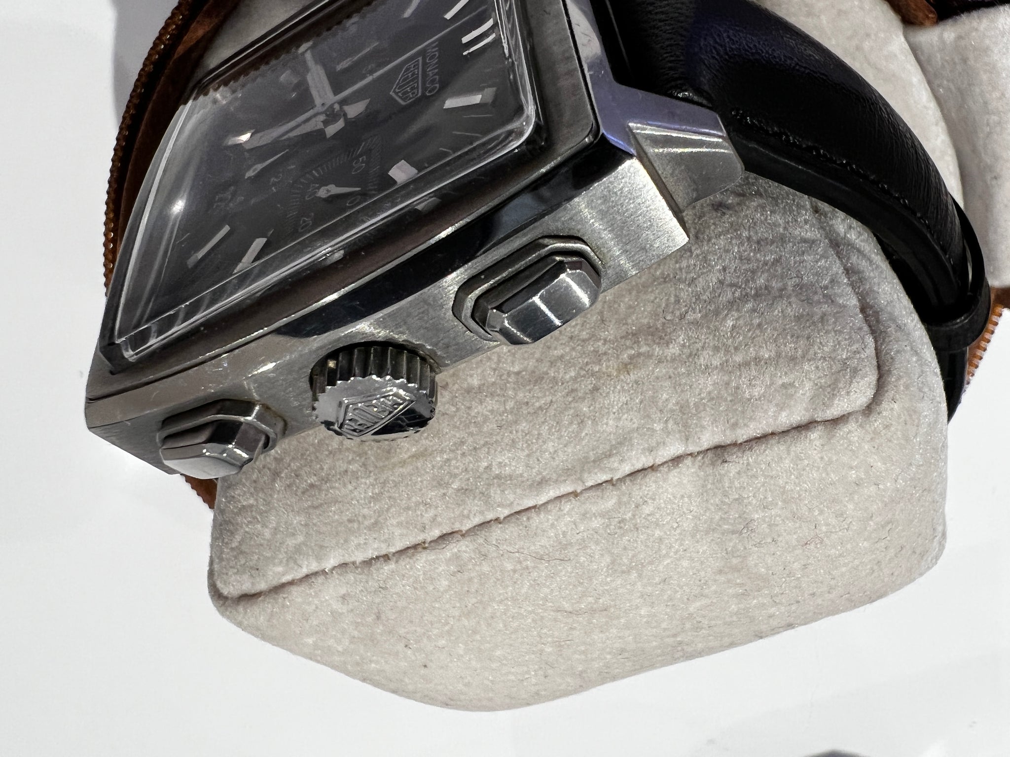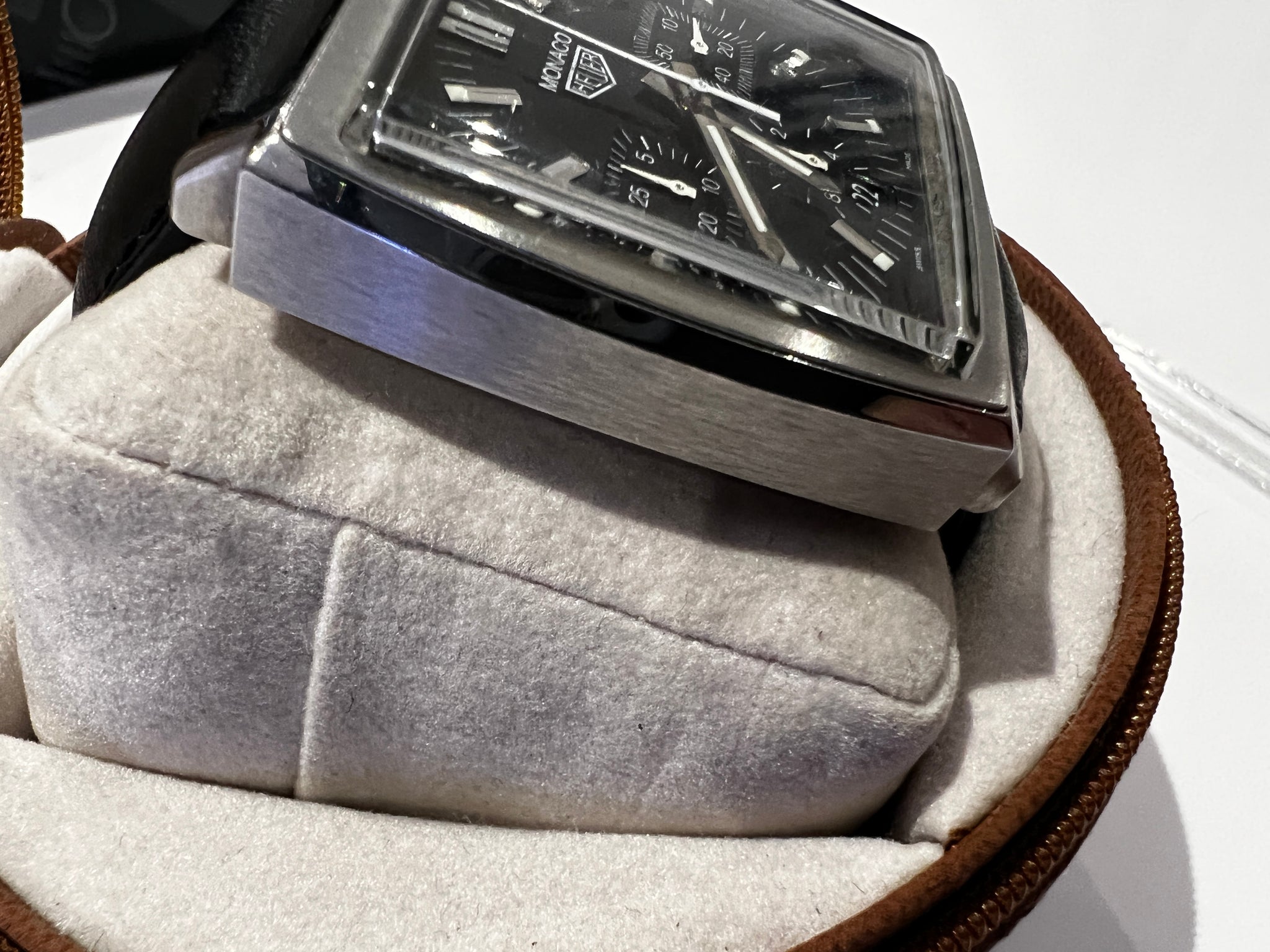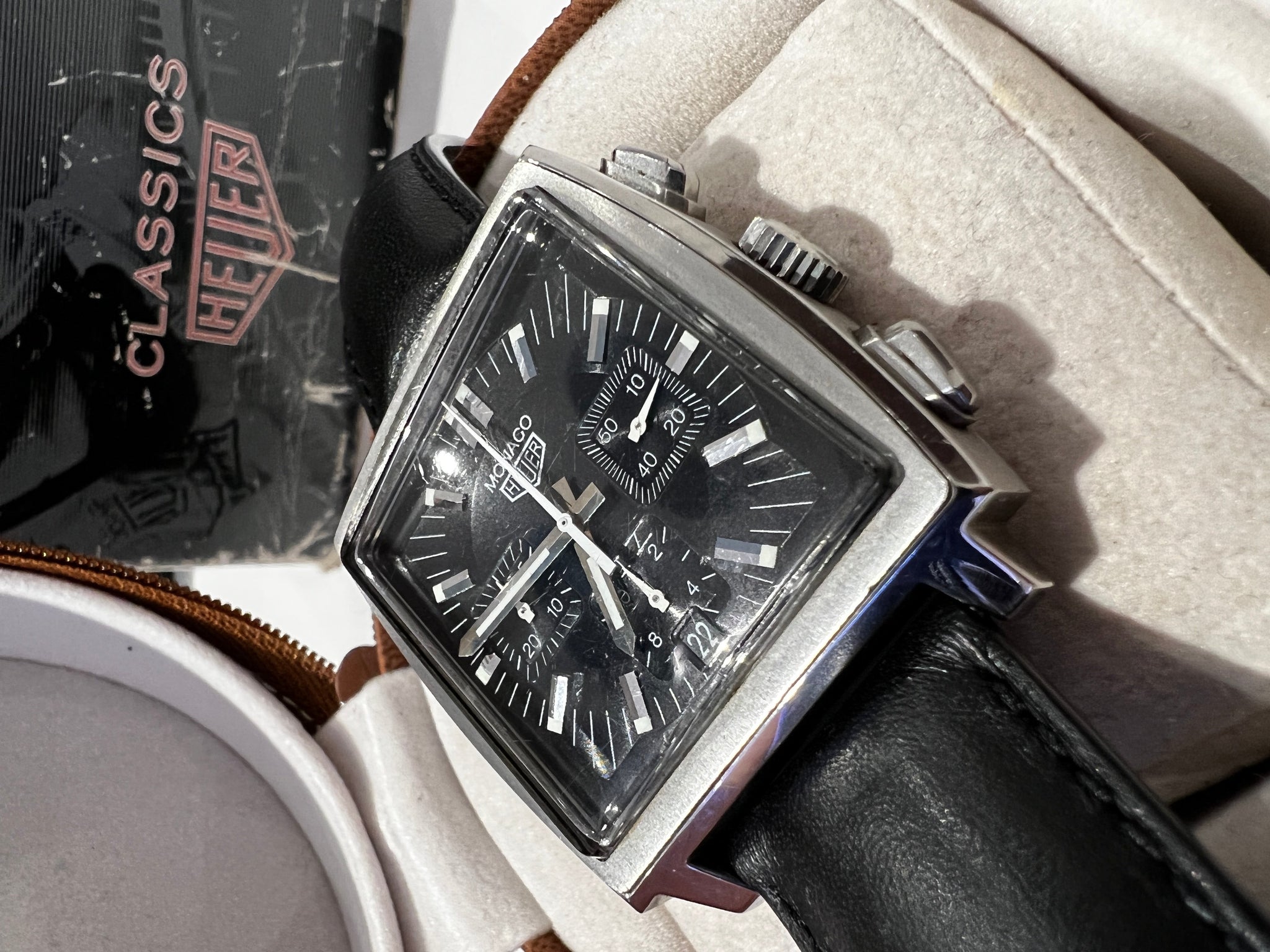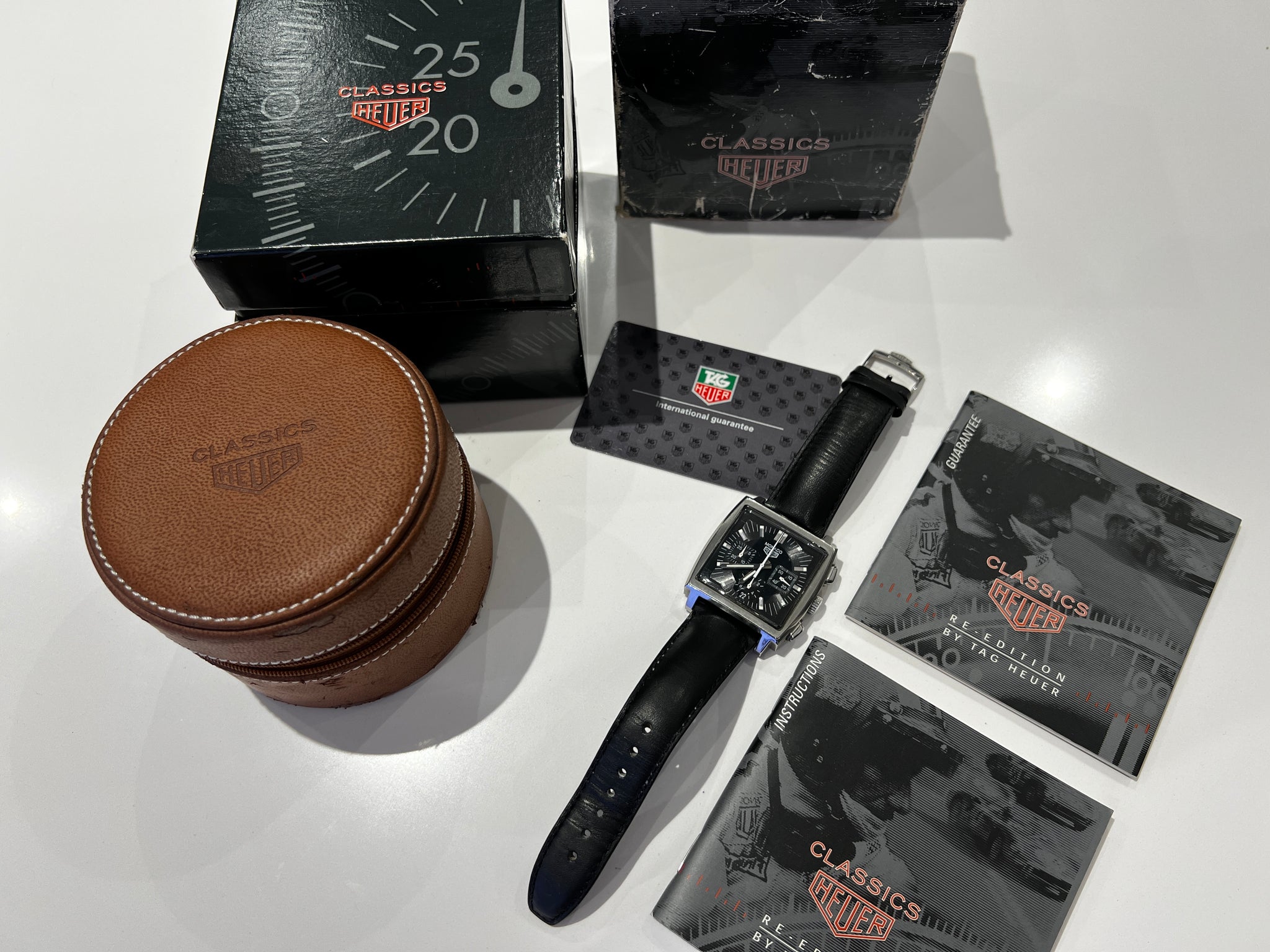 Classic modern vintage Heuer branded re-edition generation 2 Monaco dating from 2000, this watch is in excellent condition for its age, traditional black face chronograph with square pushers, one owner from new with full set, brown leatherette soft "Classic Heuer" case, box, outer sleeve, instruction & guarantee booklets and original warranty card.