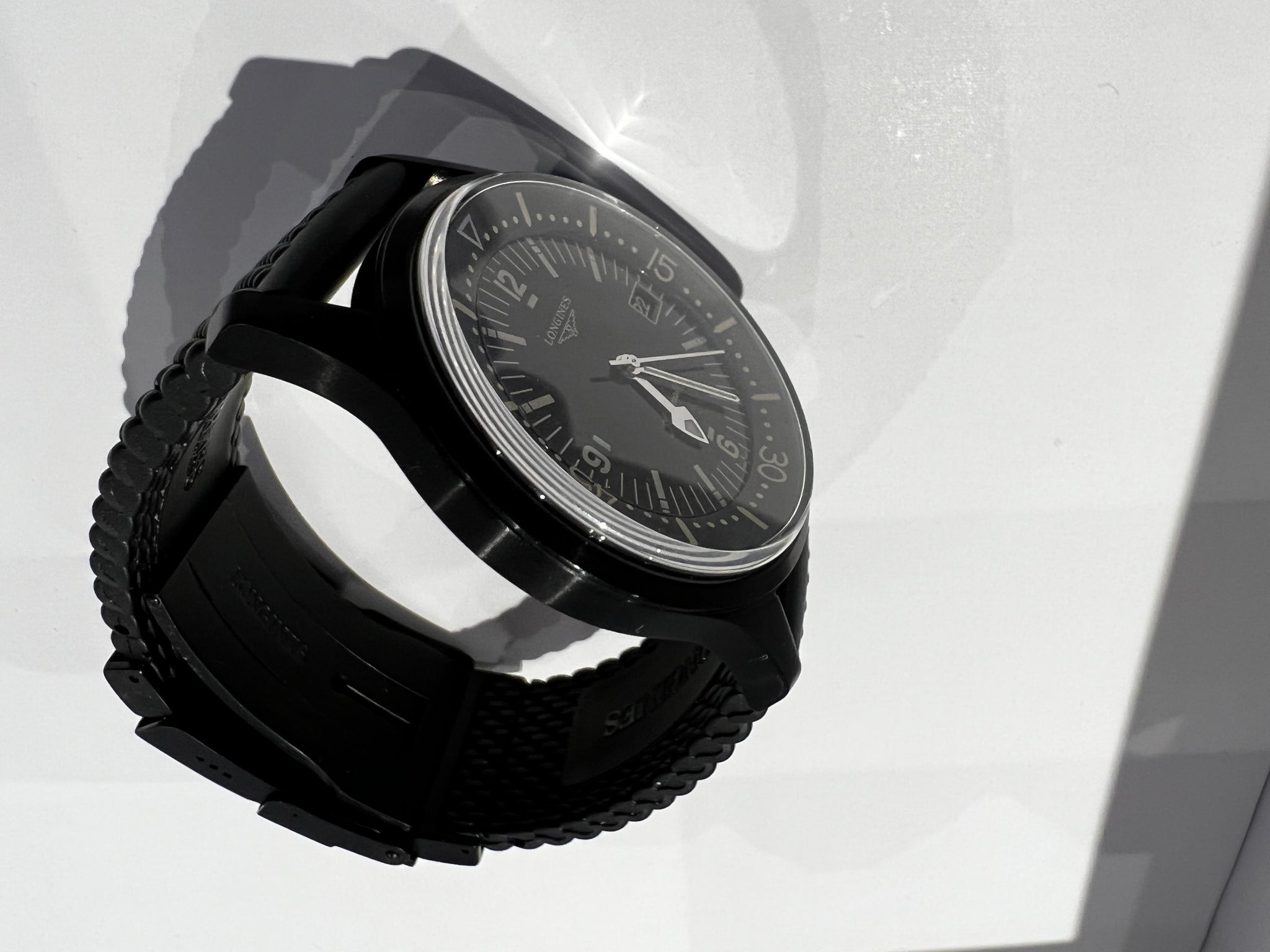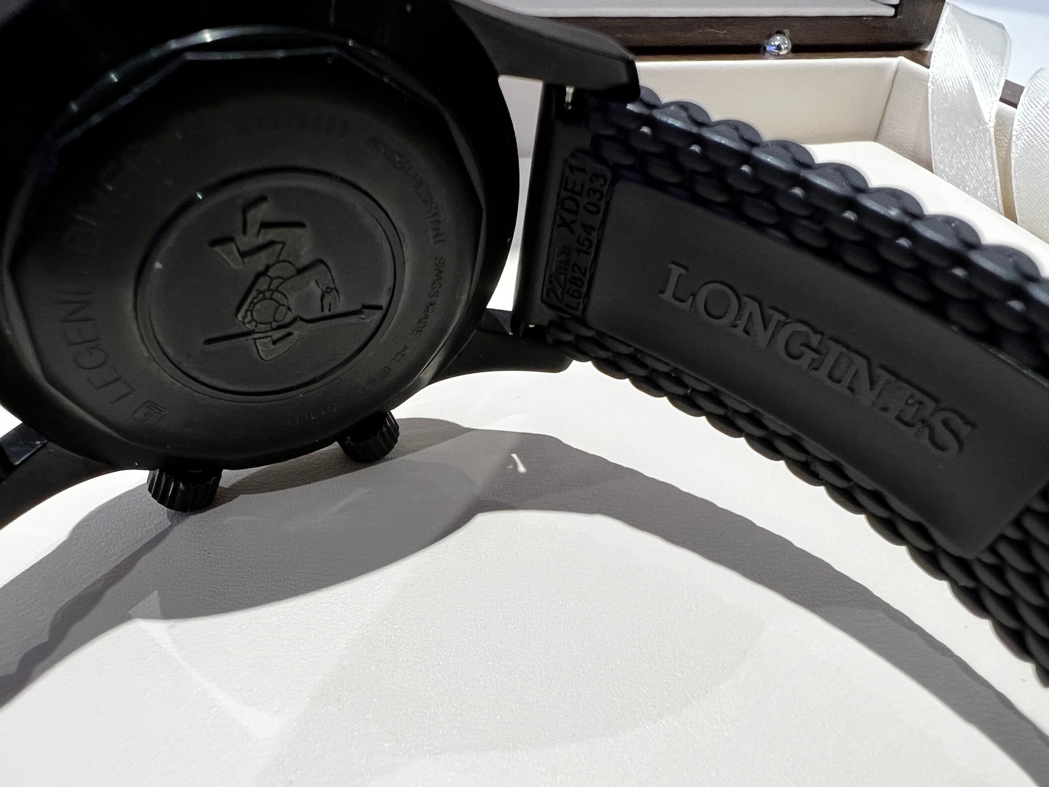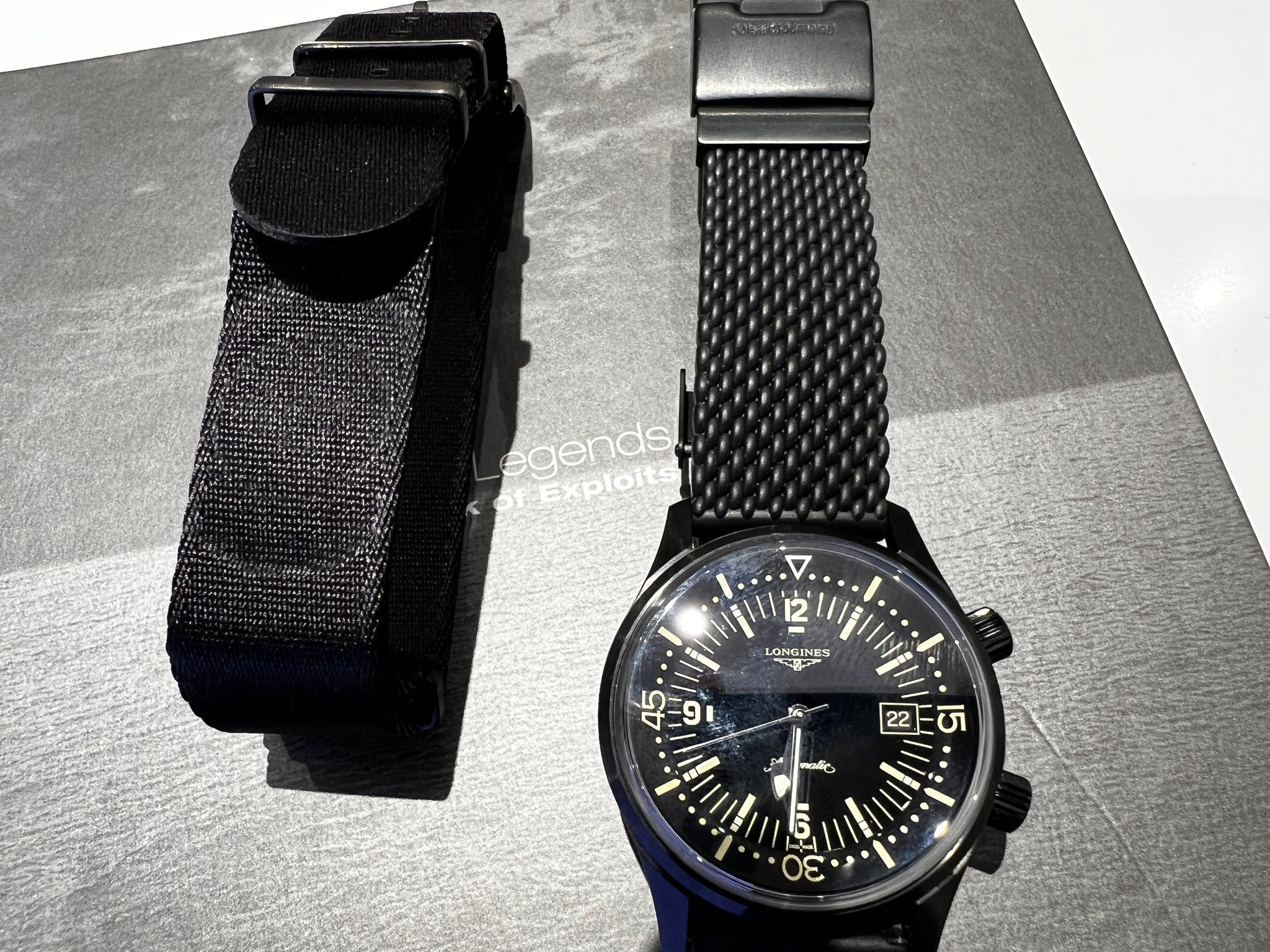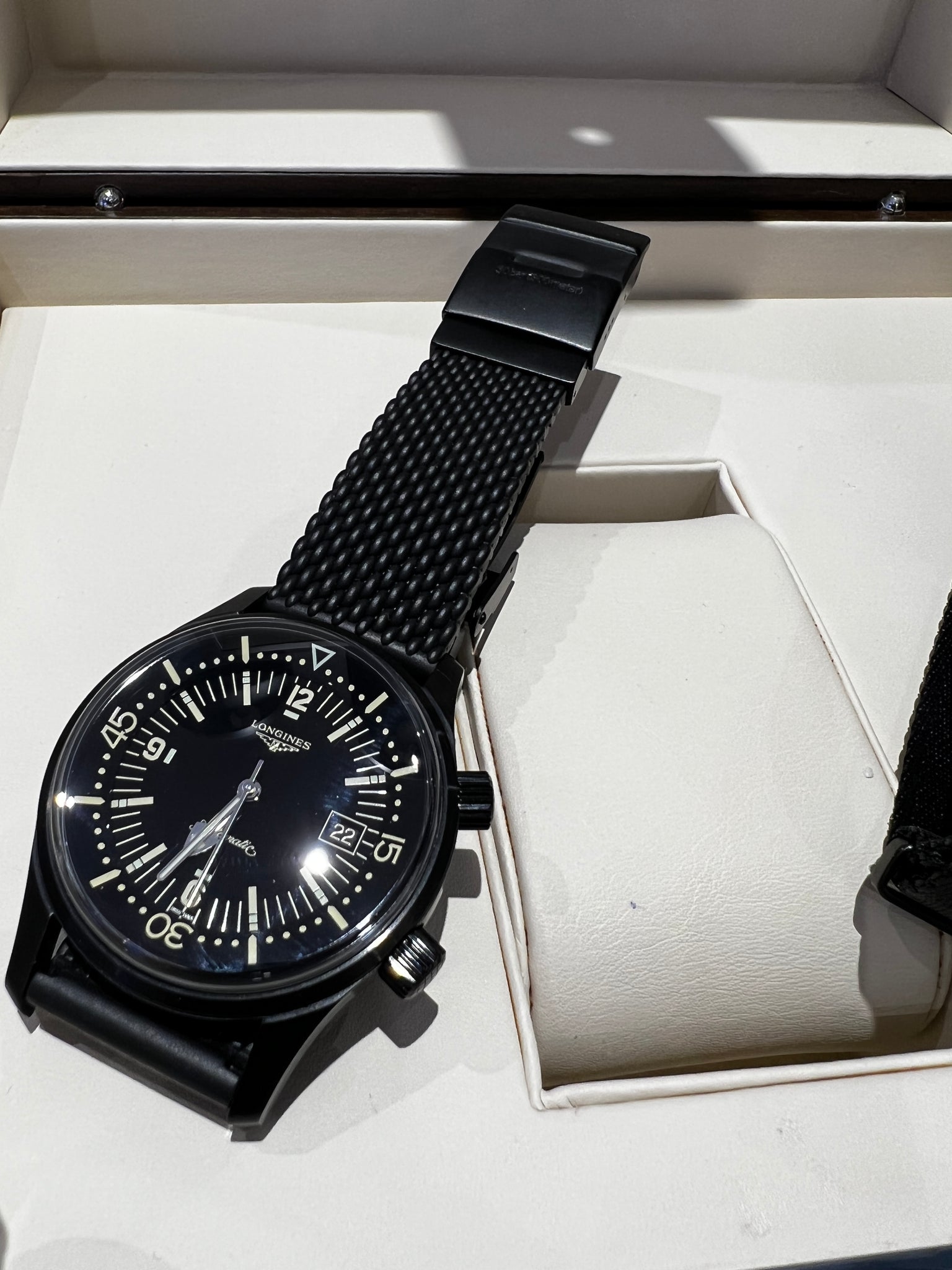 Longines heritage legend diver, classic dive watch with black PVD case, rotating inner bezel, original rubber mesh style strap with Longines deployment buckle and black Nato fabric strap, balance of 5yr warranty to January 2027