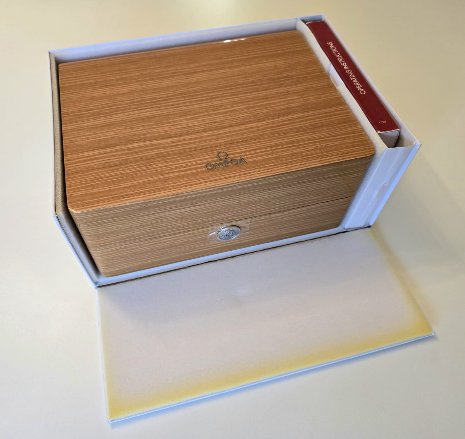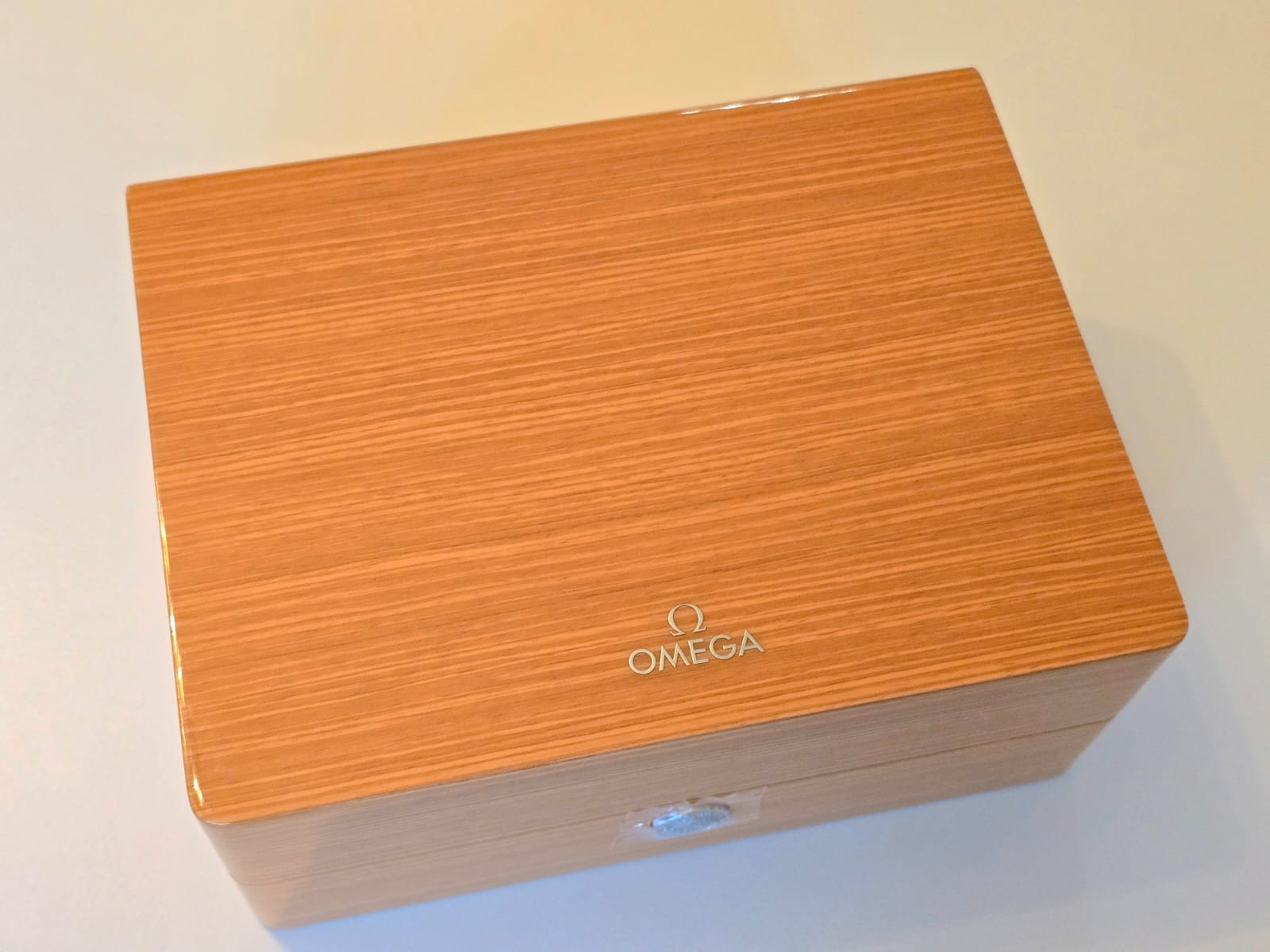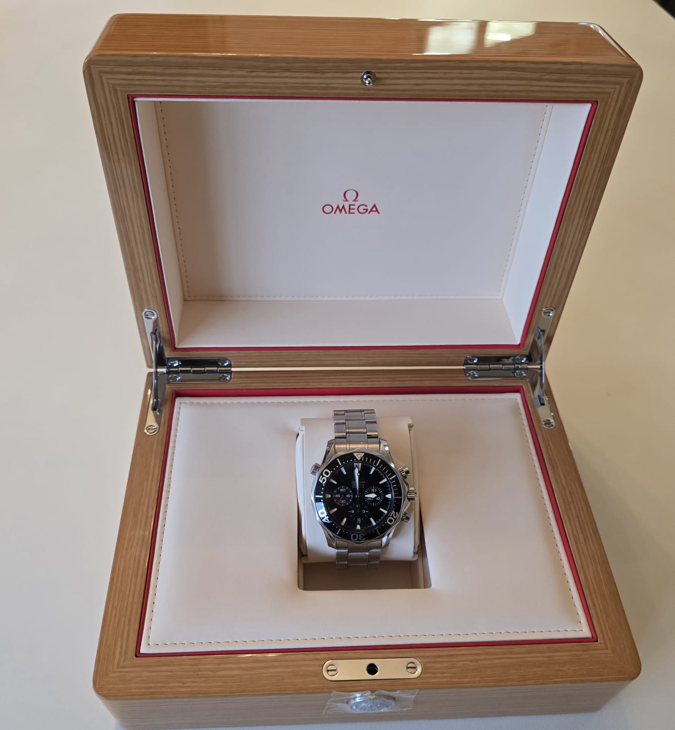 Original high quality wooden box with trim in excellent condition, original Omega cushion