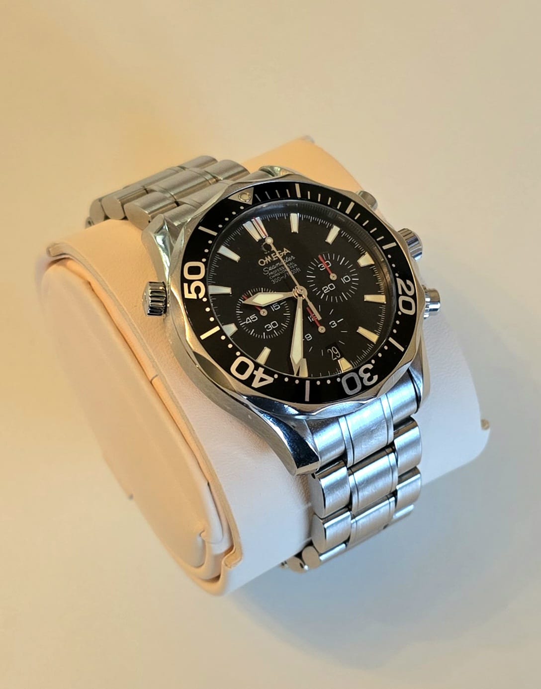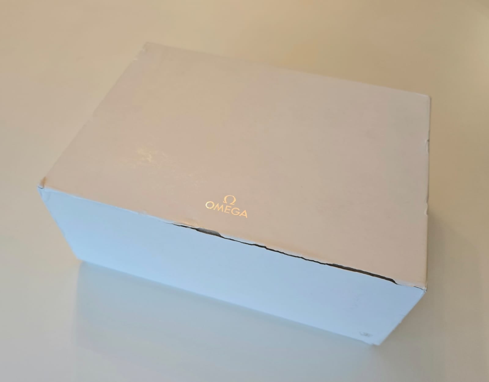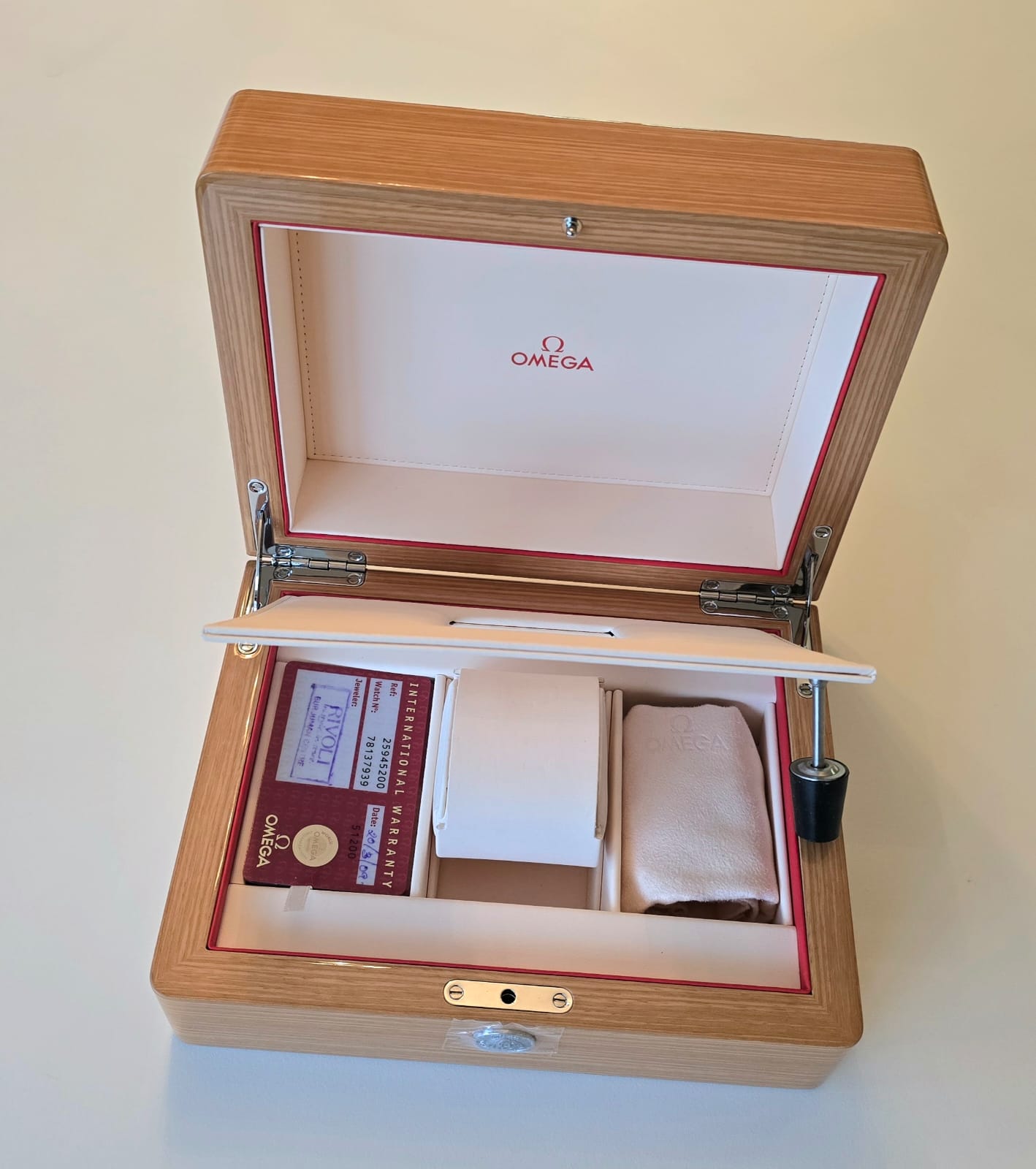 Original high quality wooden box with trim in excellent condition, original Omega cushion