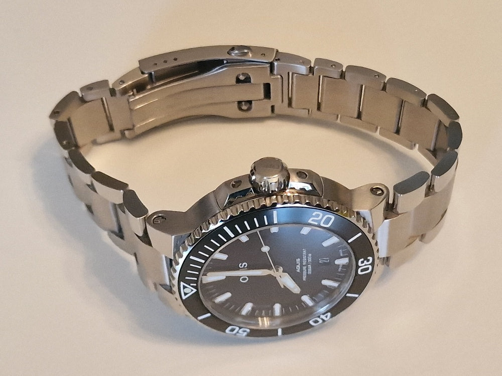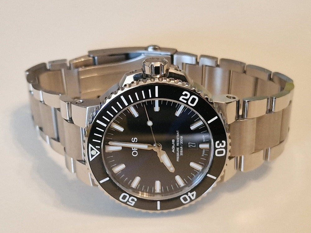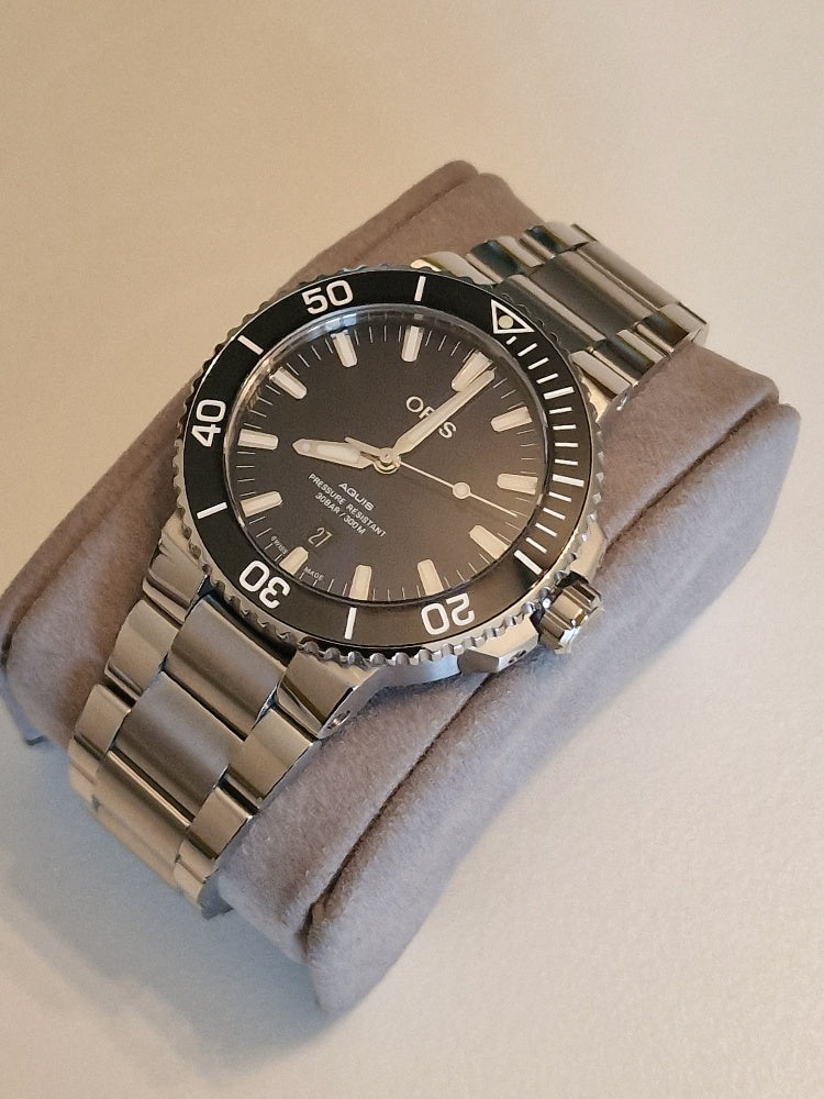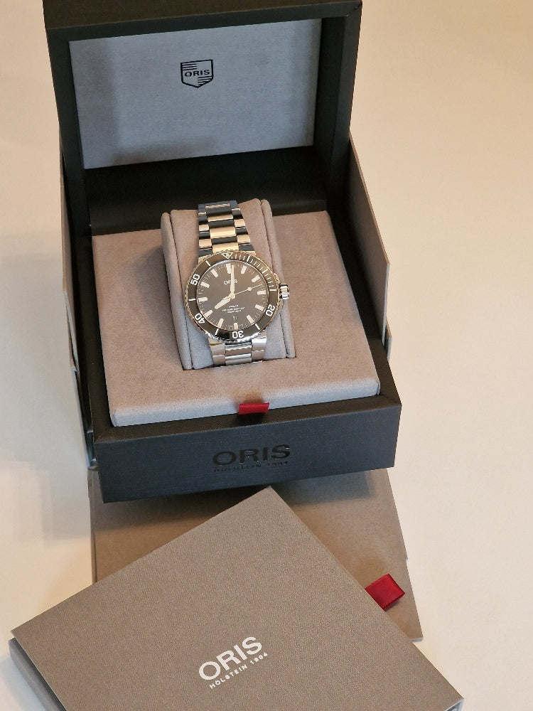 2021 Oris Air Aquis Black / Blue Date – A very complete set with outer box, all documentation including manual and warranty card. Black bezel with Blue face and white hands. Oris bracelet with all links present from new.. Excellent condition – looks brand new