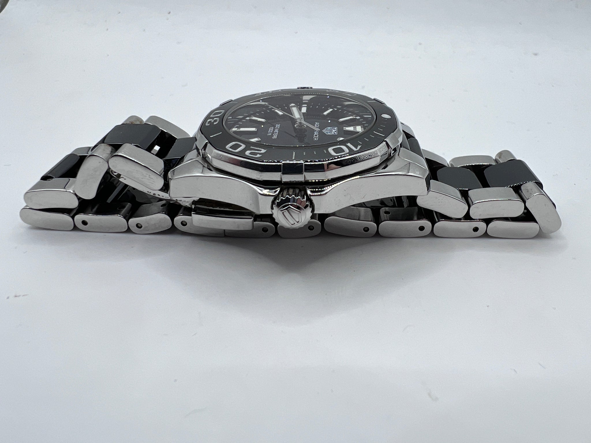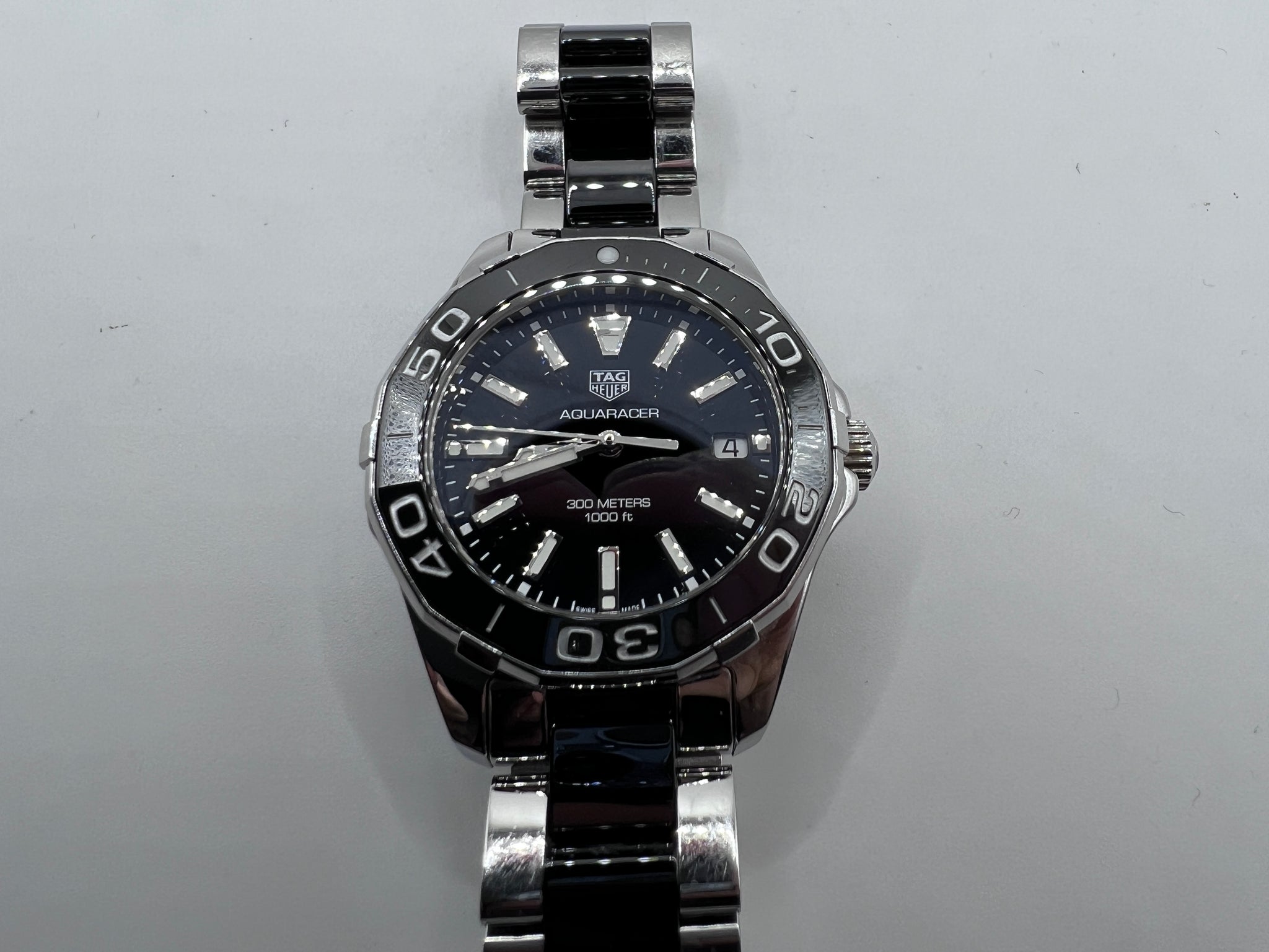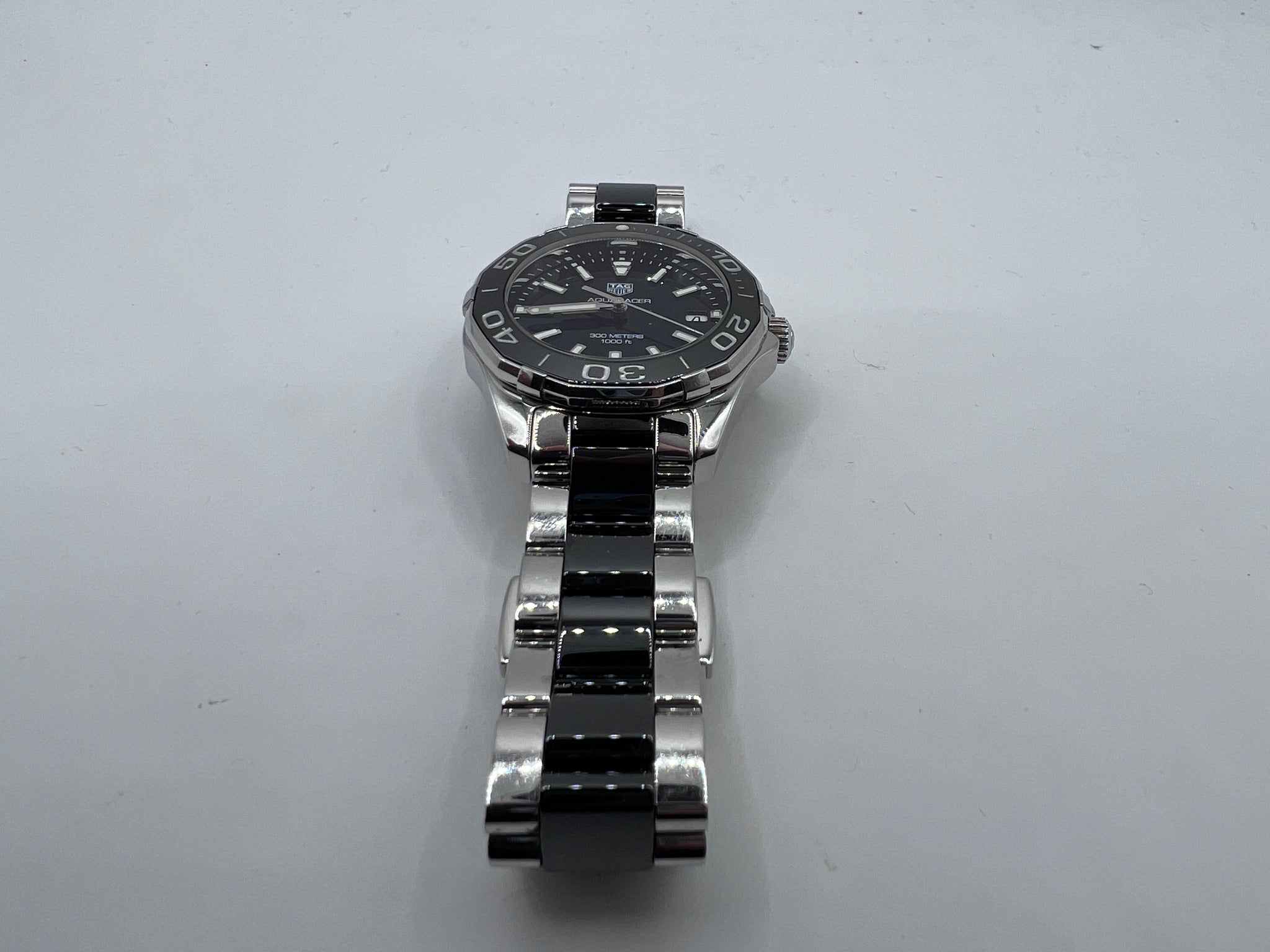Beautiful Tag Heuer Aquaracer Lady WAY131A, A fashion-forward quartz watch for sophisticated women. Black Dial, polished steel and ceramic bezel and bracelet, 300-meter water resistance, unidirectional turning bezel, luminescent dial